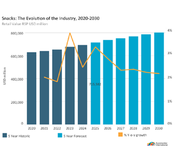 The global snack market continues its upward trajectory, reaching USD 693 billion in retail sales in 2024, according to data analytics company Euromonitor International. Driven by factors such as shifting economic power and changing consumer values, the industry is poised for further growth despite challenges from legislative uncertainties and consumer price sensitivity.